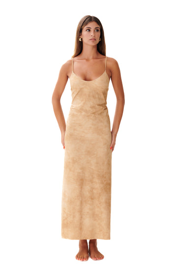 Abito in leggera microfibra scamosciata con bretelle sottili e coulisse laterali.