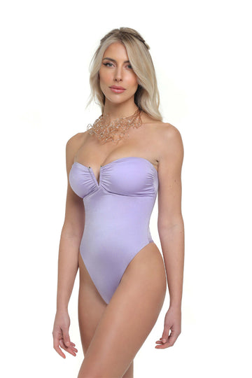 Bikini intero a bustino ultra lucente con arricciatura sul seno, coppe estraibili e ferretto a...