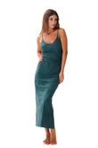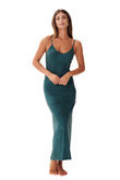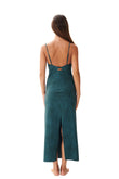 Abito aderente alla caviglia e spacco sul retro, in pregiata microfibra scamosciata, ultra leggera.