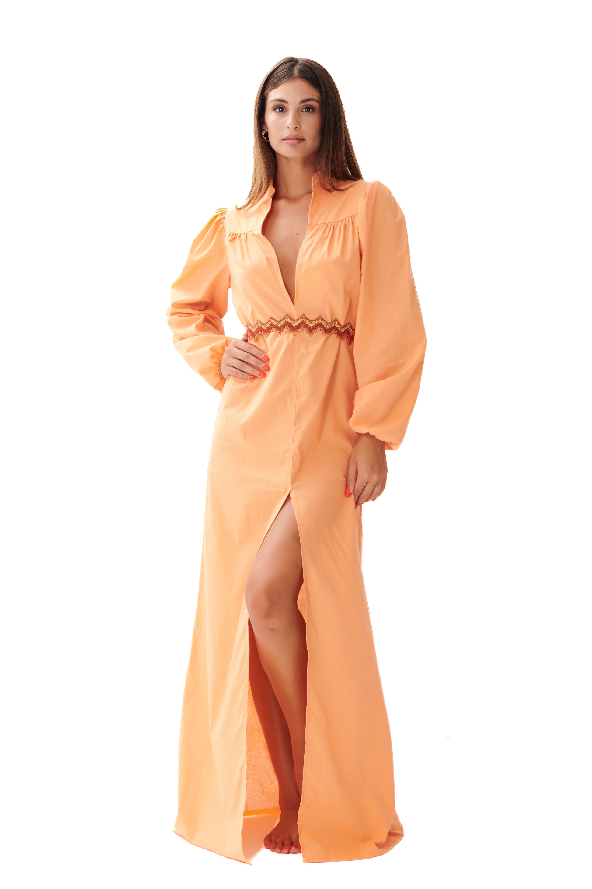 Abito chemisier in cotone leggero e fresco con collo coreano e profondo spacco centrale. Maniche lunghe a sbuffo e cintura in lurex removibile.