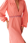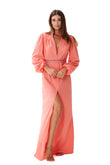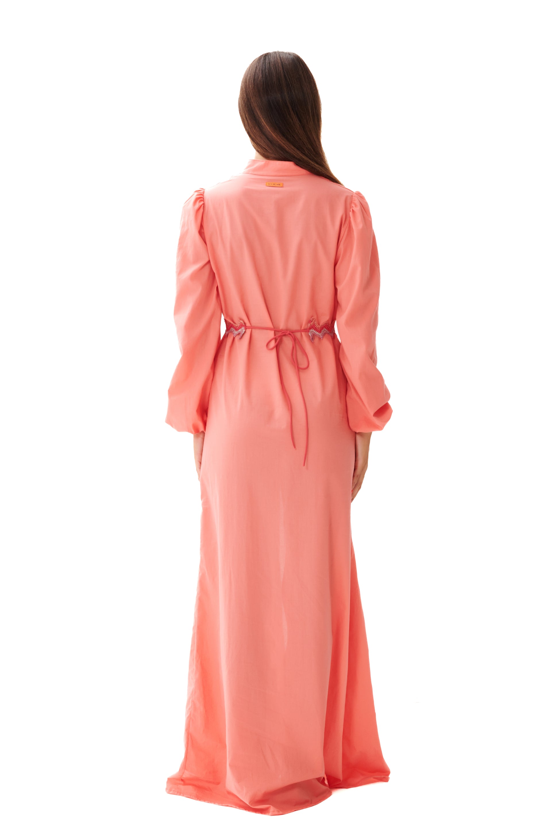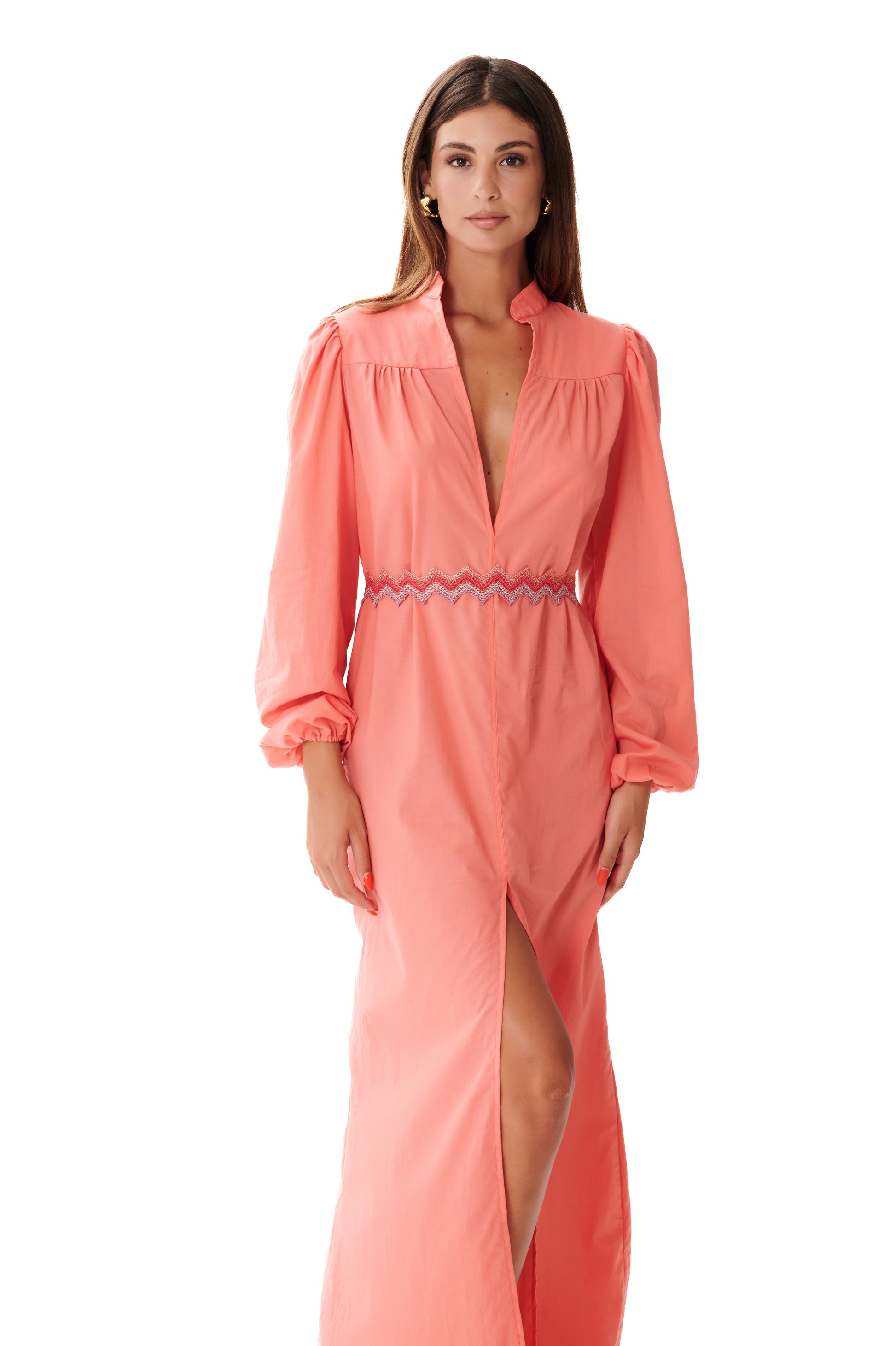 Abito chemisier in cotone leggero e fresco con collo coreano e profondo spacco centrale. Maniche lunghe a sbuffo e cintura in lurex removibile.