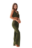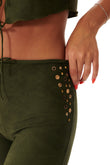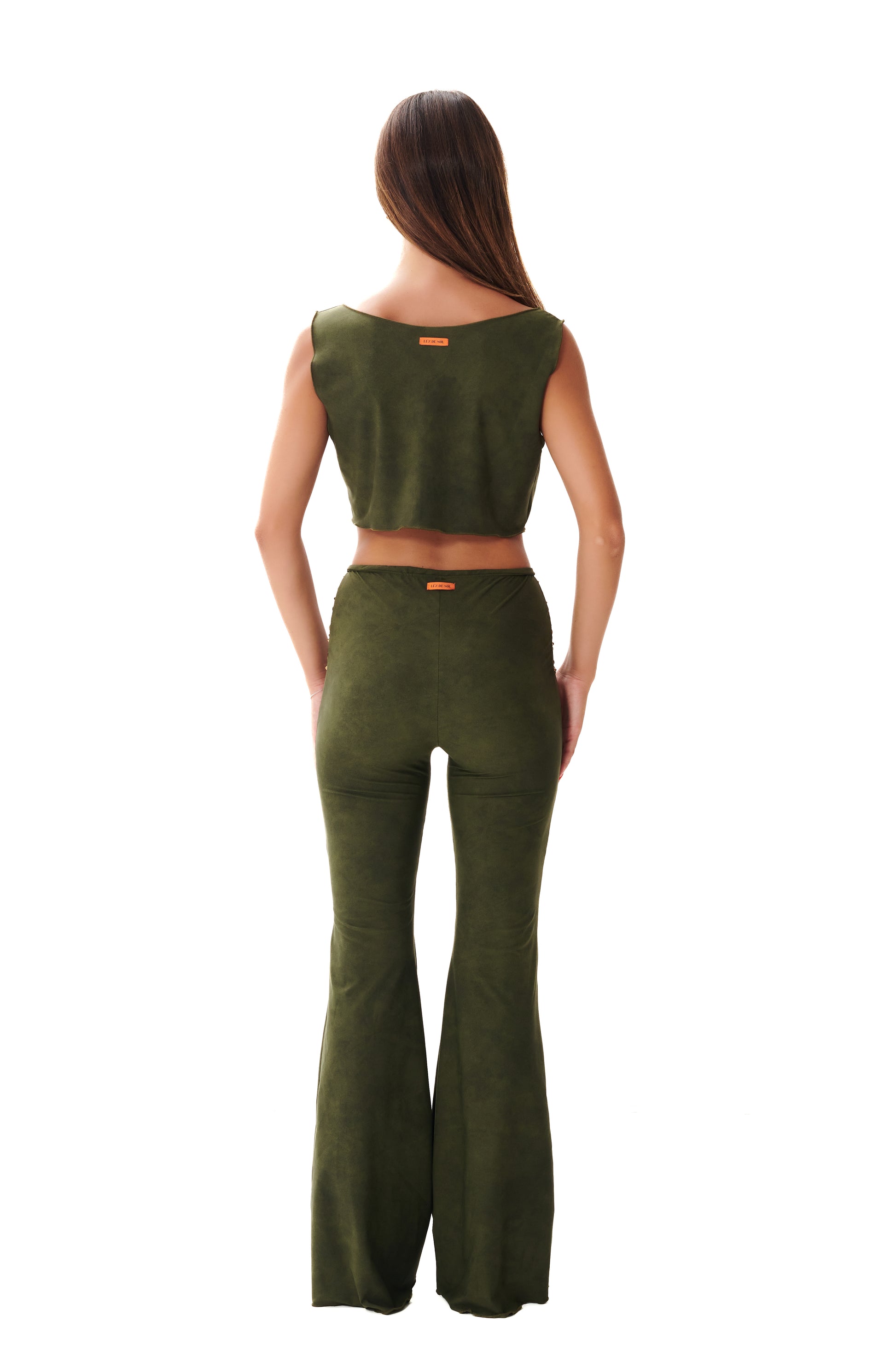 Il set lùz è composto da un top gilet in leggera microfibra scamosciata e chiusura con laccetti, ed un leggero pantalone a zampa impreziosito da borchie sui fianchi.
