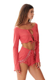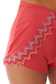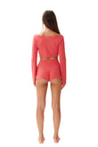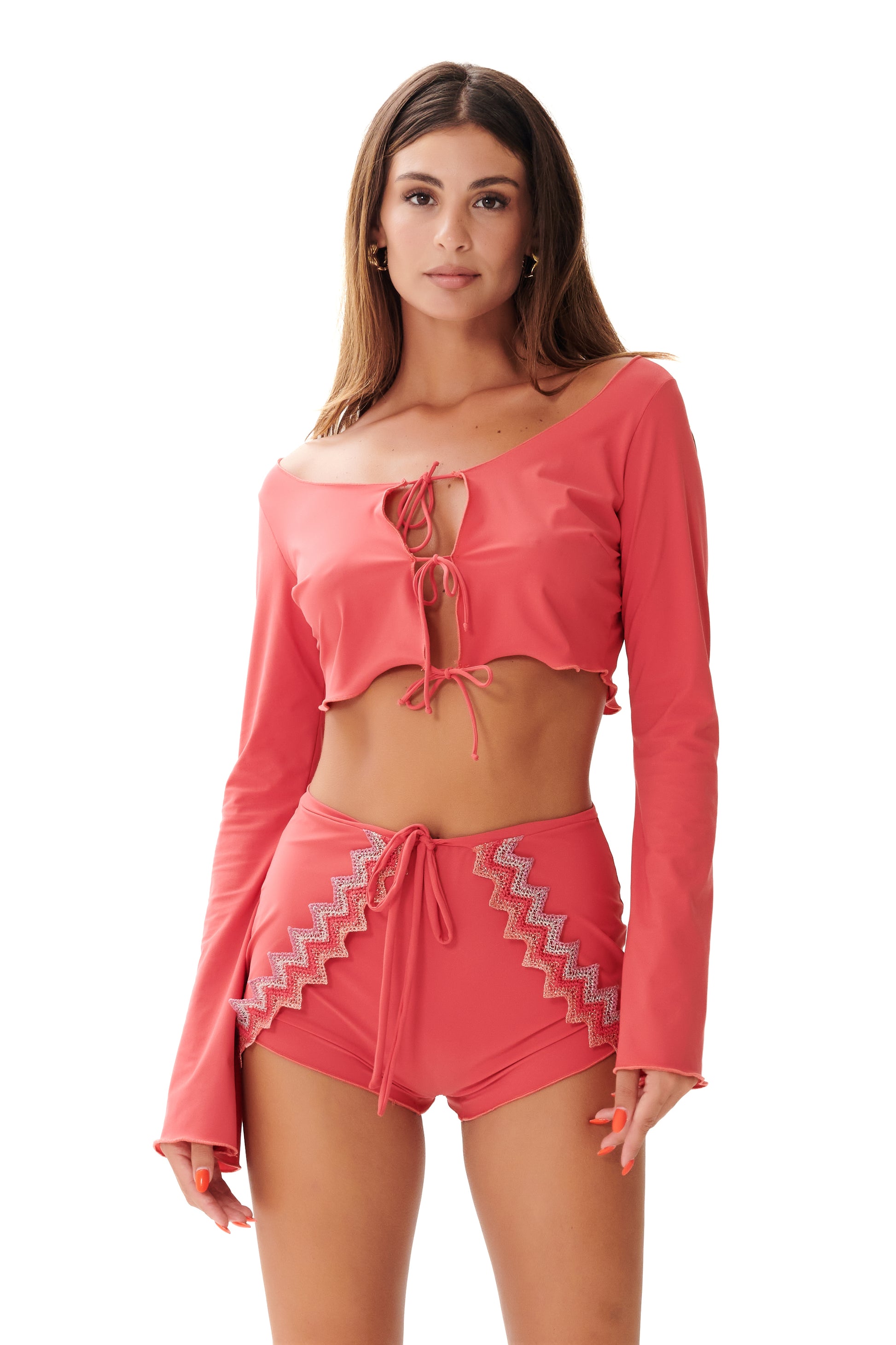 Coordinato in leggera microfibra di alta qualità composto da top a manica lunga e chiusura lacci, e pantaloncino culotte impreziosito da una passamaneria in lurex.