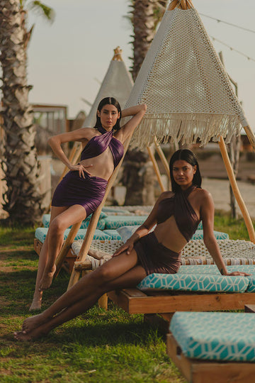 Completo con top cruzado y falda con centro fruncido. Perfecto tanto para cubrirse como para salir por la noche. Tejido efecto satinado con un brillo extraordinario.