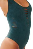 Costume da bagno intero in pregiata microfibra scamosciata ,ultra leggera, caratterizzato da tagli laser. Retro con taglio brasiliana.