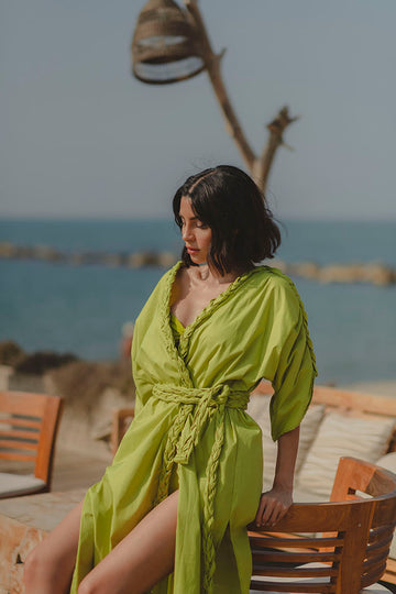 Kimono con mangas anchas enmarcadas por una trenza hecha a mano. Aberturas laterales. Cinturón con trenza.