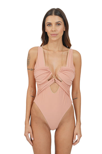 Costume intero con scollo profondo. Drappeggi con taglio cut out regolabili. Framis lurex ai bordi.