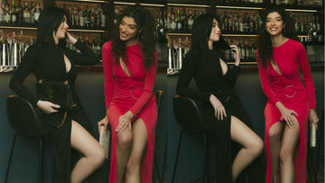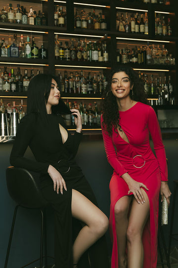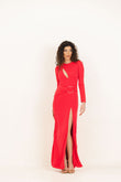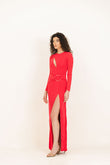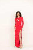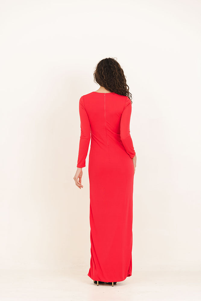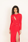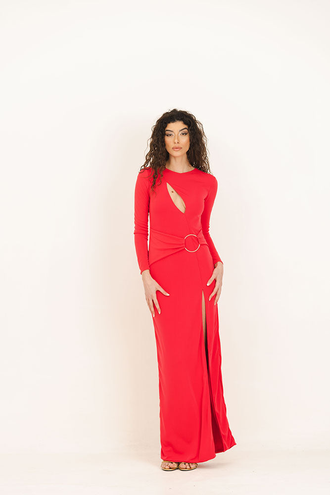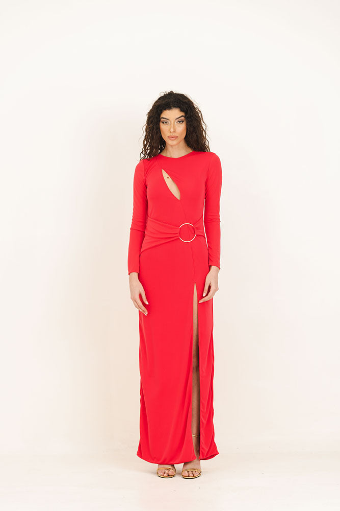 Abito lungo a manica lunga in tessuto ricamato e foderato con scollatura sul seno e spacco profondo. Cintura fasciante con anello.