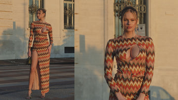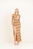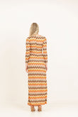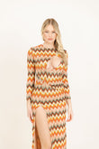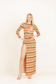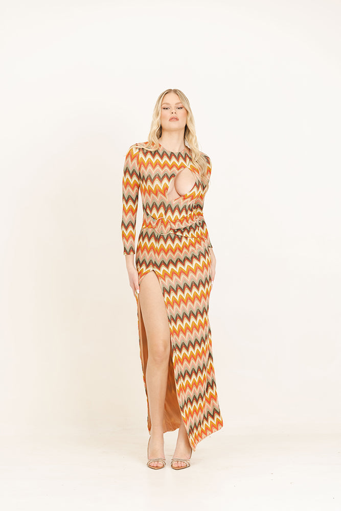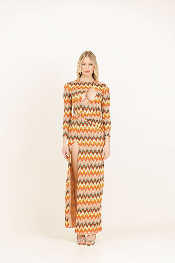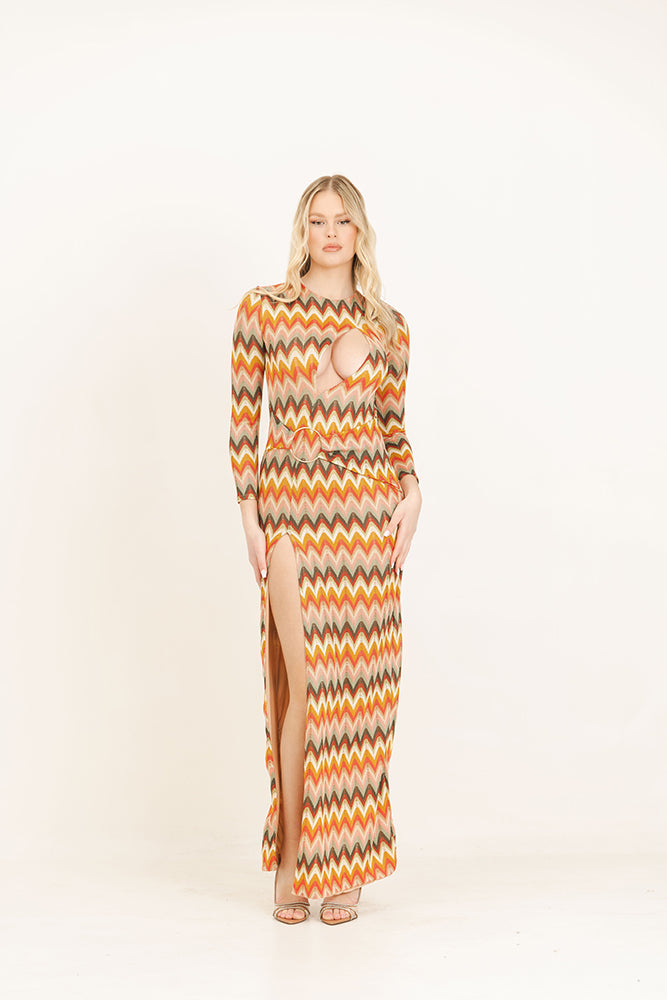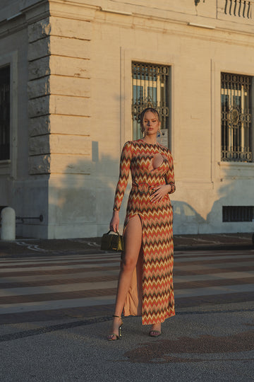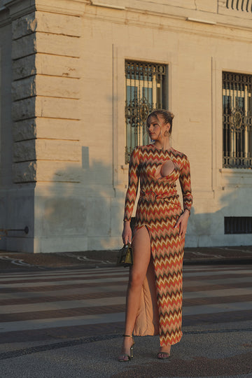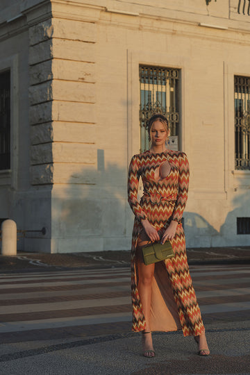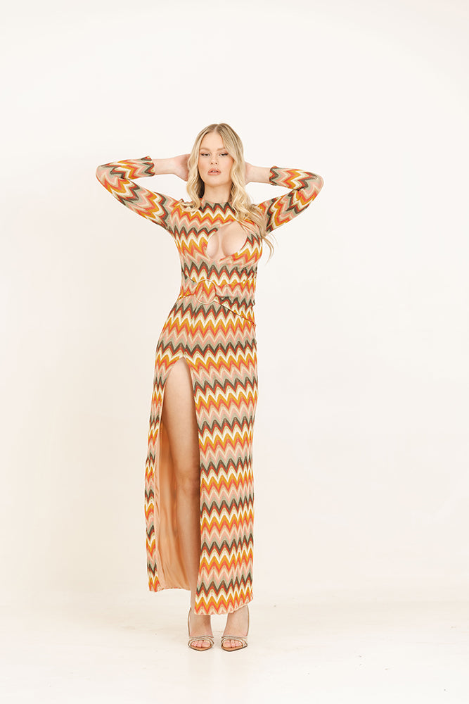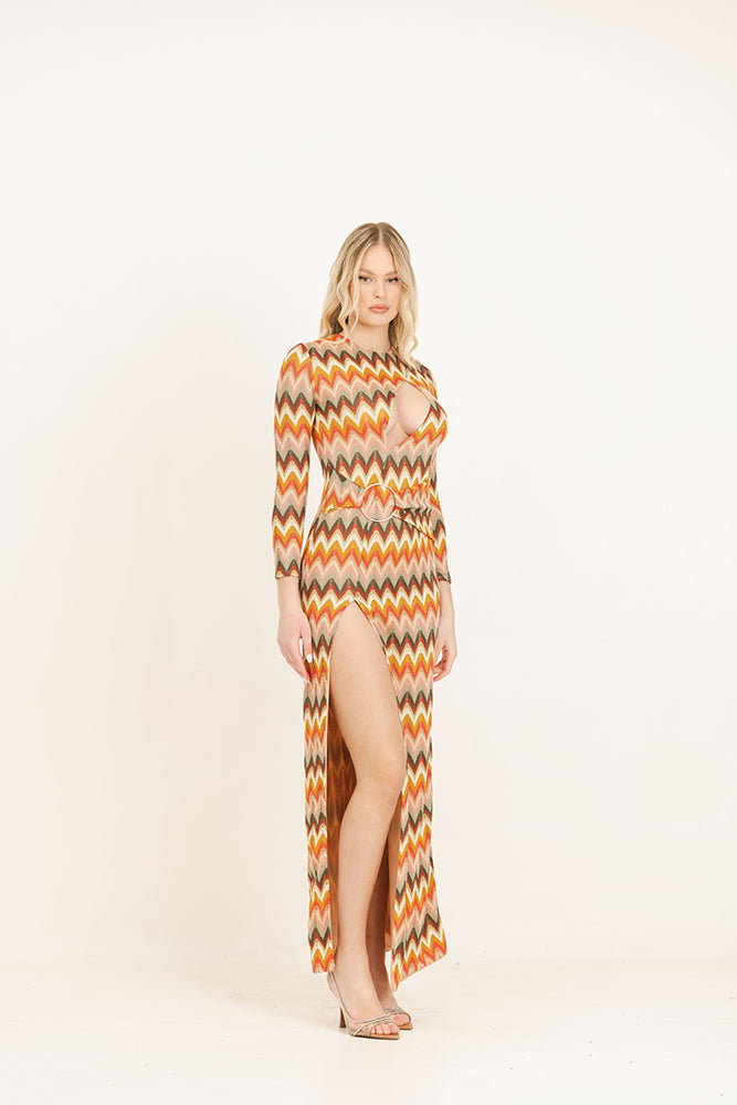 Abito lungo a manica lunga in tessuto ricamato e foderato con scollatura sul seno e spacco profondo. Cintura fasciante con anello.