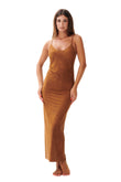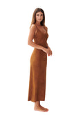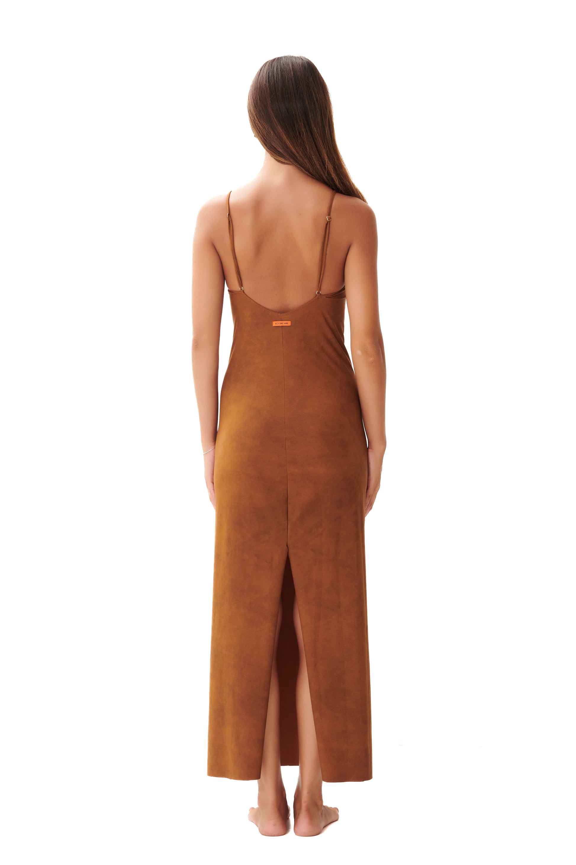 Abito aderente alla caviglia e spacco sul retro, in pregiata microfibra scamosciata, ultra leggera.