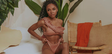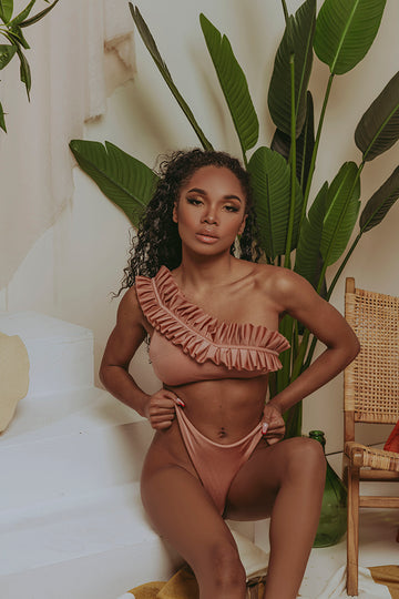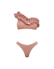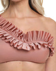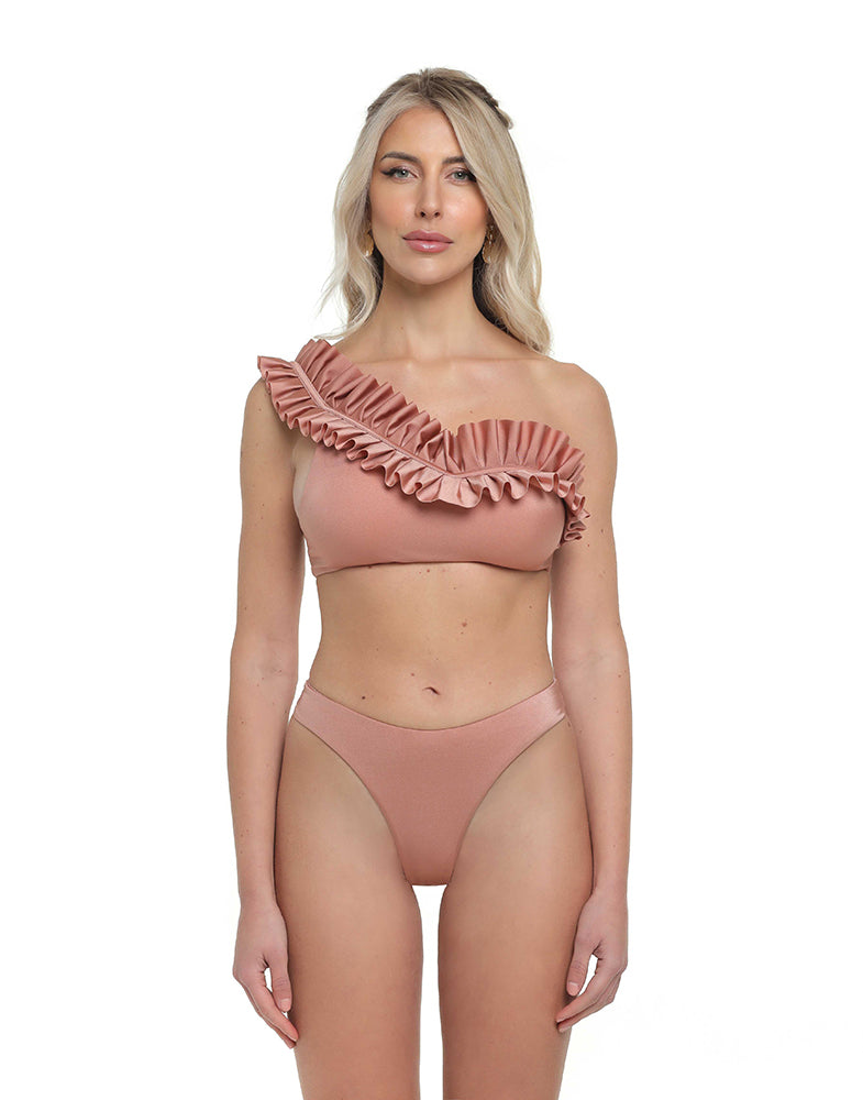 Bikini a fascia a monospalla con coppe estraibili con lavorazione a pieghe baciate.