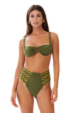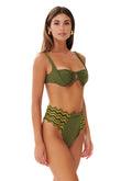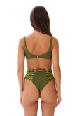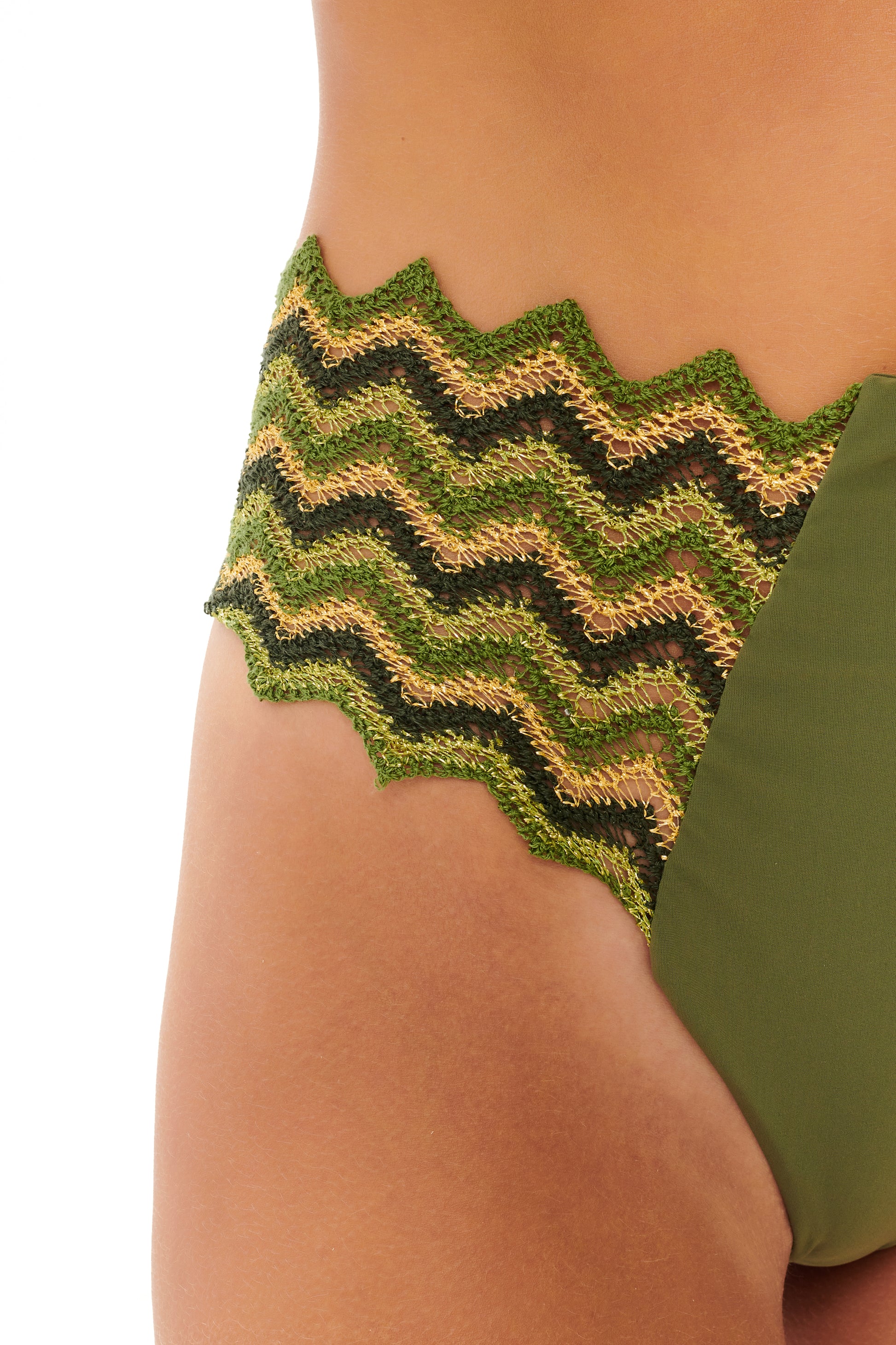 Costume da bagno in microfibra di alta qualità a due pezzi composto da top con ferretto e arriccio centrale e chiusura con gancio . Lo slip a vita alta ha un design con preziosa passamaneria a zig zag sui fianchi.