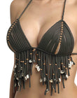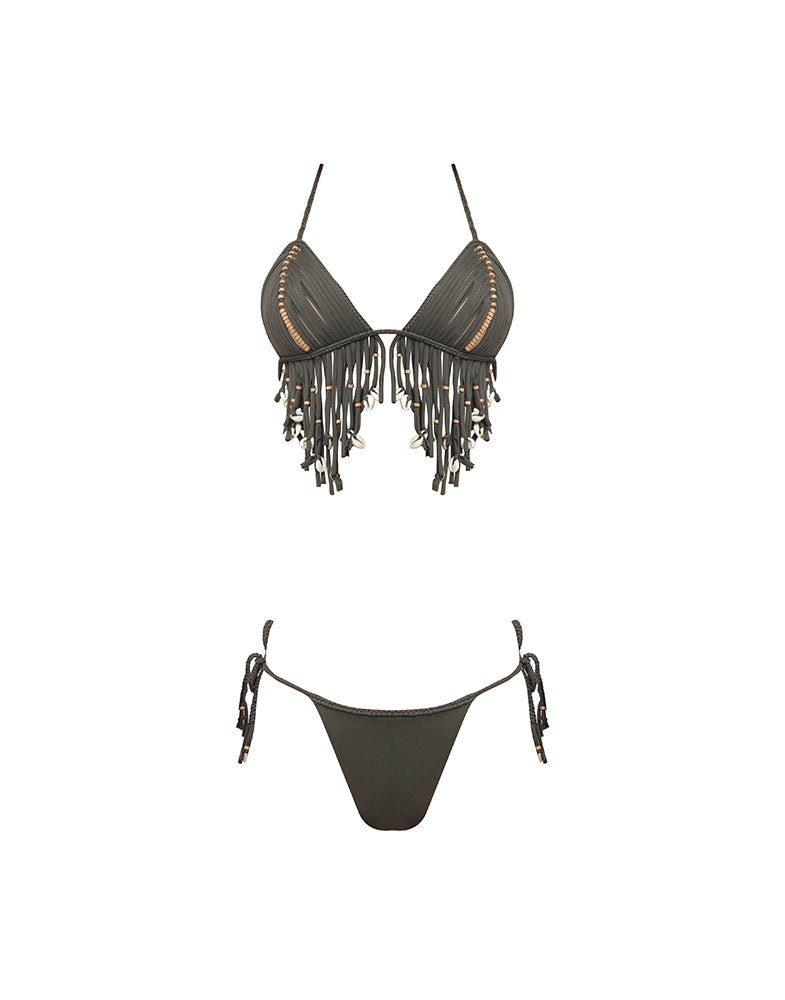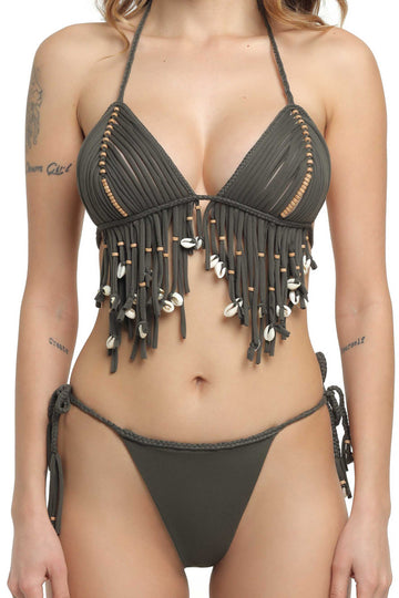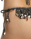 Top a triangolo con coppe estraibili lavorato con singole strisce per un effetto corda lavorato e rifinito a mano con conchiglie e perline. Frange stratificate sotto seno e laccetti intrecciati. Slip a perizoma con laccetti intrecciati con frange stratificate che coprono sul retro.
