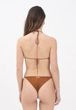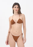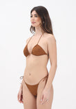 Costume da bagno a due pezzi in preziosa microfibra scamosciata ,composto da top a triangolo rovesciato e slip a brasiliana con laccetti e coprinodo oro.