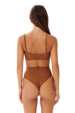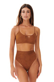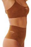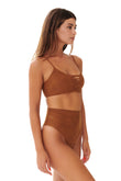 Costume da bagno a due pezzi in pregiata microfibra scamosciata, ultra leggera, composto da top con tagli laser e slip a vita alta taglio laser.