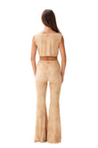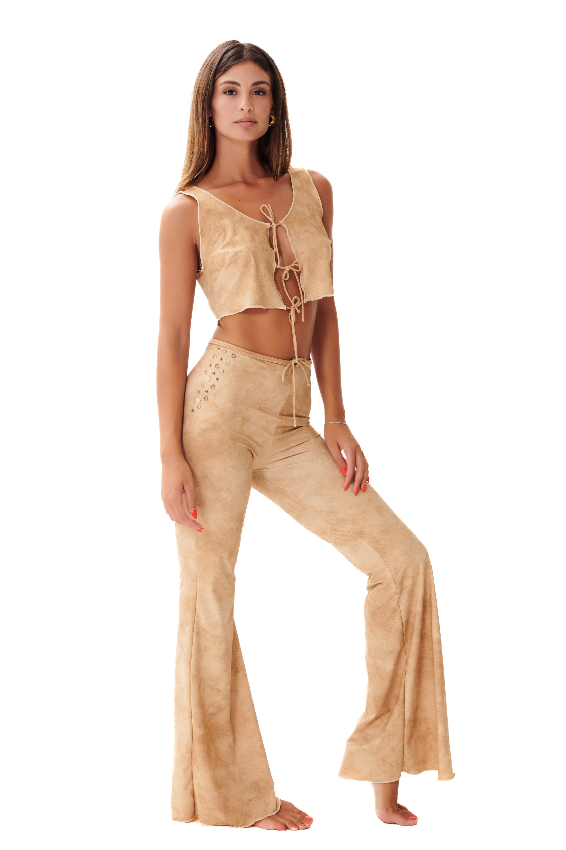 Il set lùz è composto da un top gilet in leggera microfibra scamosciata e chiusura con laccetti , ed un leggero pantalone a zampa impreziosito da borchie sui fianchi.