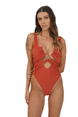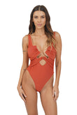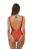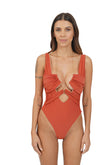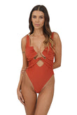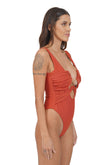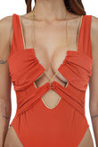 Costume intero con scollo profondo. Drappeggi con taglio cut out regolabili. Framis lurex ai bordi.