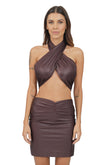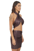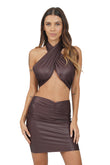 Completo con top ad incrocio e gonna con ariccio al centro. perfetto sia come copricostume che per una serata. Tessuto effetto raso dalla straordinaria lucentezza.