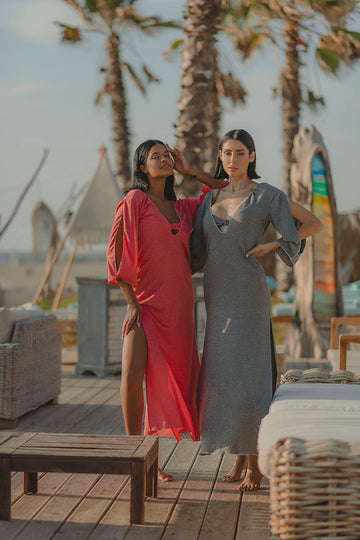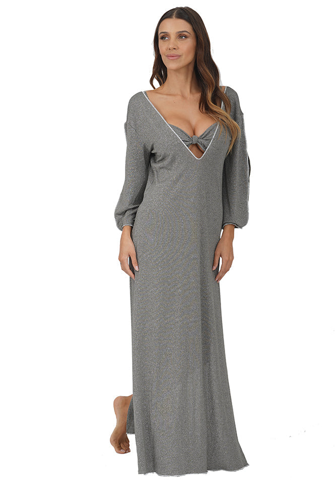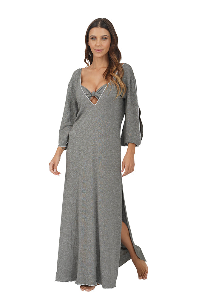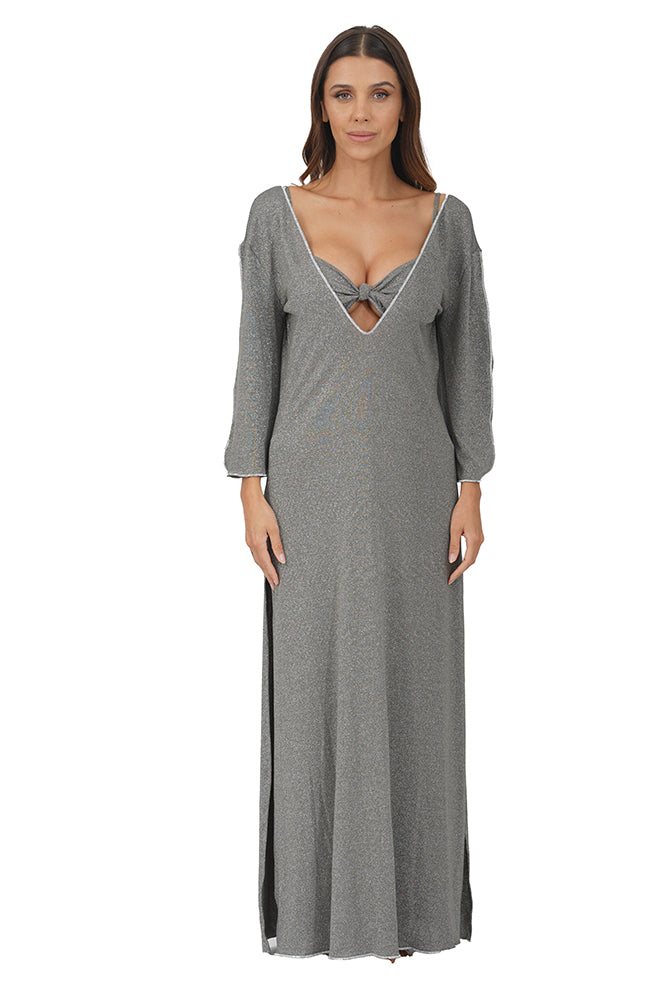 Copricostume in tessuto lurex e framis con scollo profondo sul davanti e sul retro. Manica aperta.
