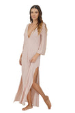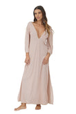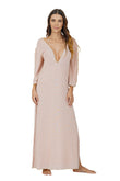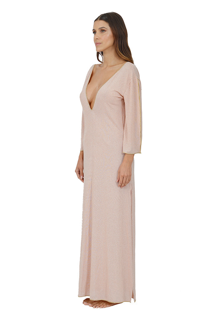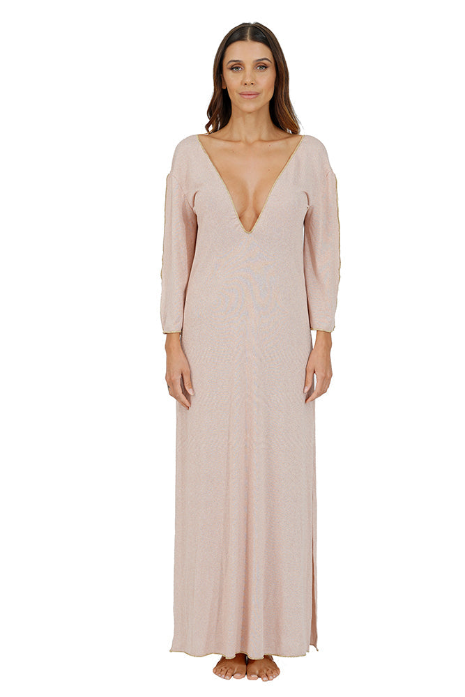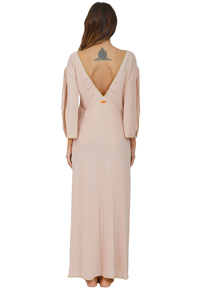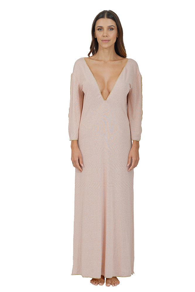 Copricostume in tessuto lurex e framis con scollo profondo sul davanti e sul retro. Manica aperta.