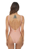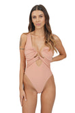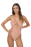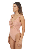 Costume intero con scollo profondo. Drappeggi con taglio cut out regolabili. Framis lurex ai bordi.