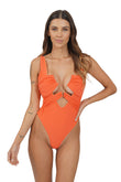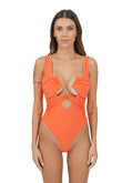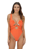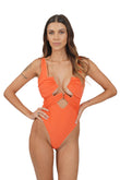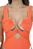 Costume intero con scollo profondo. Drappeggi con taglio cut out regolabili. Framis lurex ai bordi.