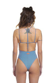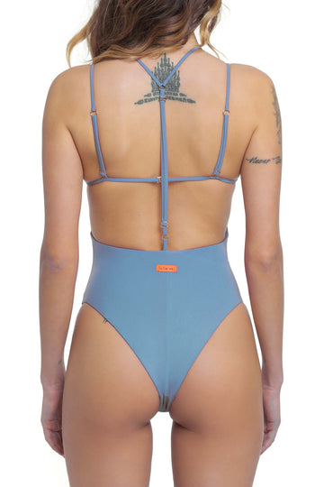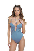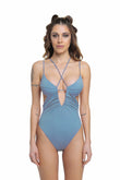 Costume intero con spalline sottili regolabilie chiusura sul retro con gangetto a scomparsa. Scollatura profonda con tagli cut out sul davanti.