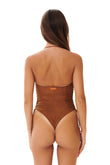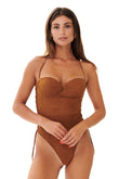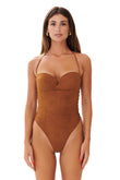 Costume da bagno intero in pregiata microfibra scamosciata, caratterizzato da chiusura con lacci per una vestibilità personalizzata e coppe push-up.