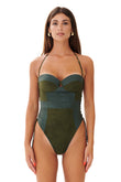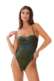 Costume da bagno intero in pregiata microfibra scamosciata, caratterizzato da chiusura con lacci per una vestibilità personalizzata e coppe push-up.