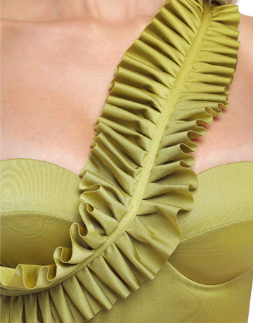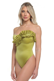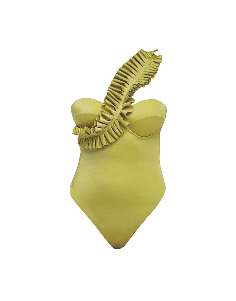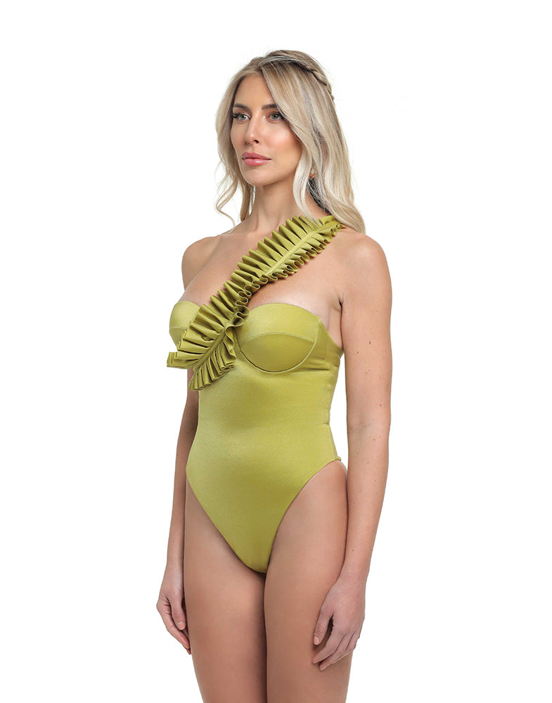 Costume intero con ferretto e coppe imbottite dal taglio alto che accentua la figura femminile. Versatile monospalla con lavorazione a pieghe baciate