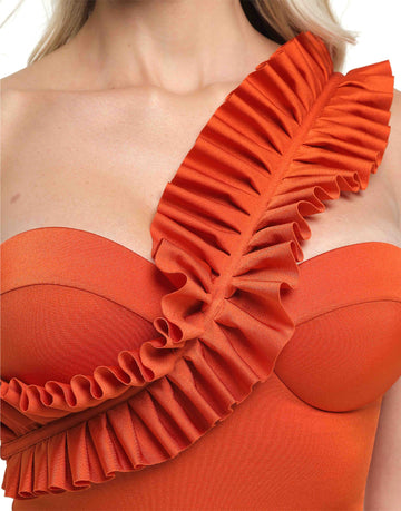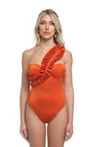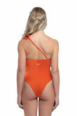 Costume intero con ferretto e coppe imbottite dal taglio alto che accentua la figura femminile. versatile monospalla con lavorazione a pieghe baciate da poter essere indossato in diversi modi.