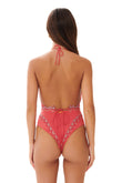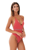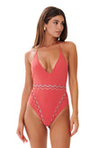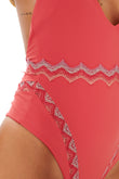 Costume da bagno intero con scollo profondo impreziosito da una passamaneria a zig zag in lurex e cintura in vita.