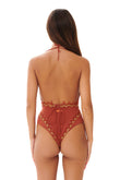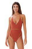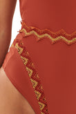 Costume da bagno intero con scollo profondo impreziosito da una passamaneria a zig zag in lurex e cintura in vita.
