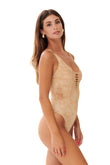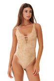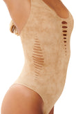 Costume da bagno intero in pregiata microfibra scamosciata ,ultra leggera, caratterizzato da tagli laser. Retro con taglio brasiliana.
